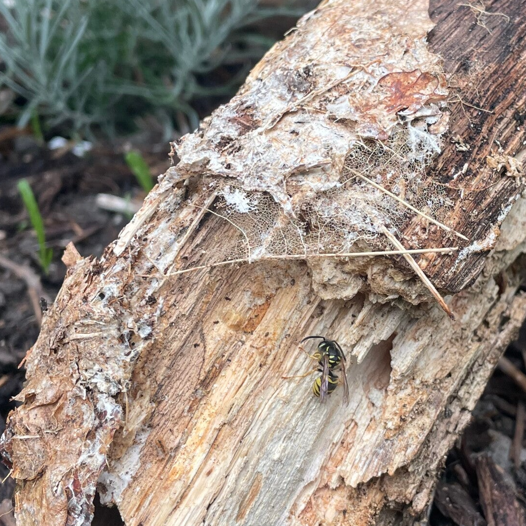 Im Kräuterbeet habe ich ein Stück Totholz integriert – als Trittelement, aber auch als potenziellen Lebensraum für Kleinstlebewesen. Kaum lag es dort, hatte eine Wespe es für sich entdeckt. Ein feines Raspeln verriet sie: Sie schabte Zellulose ab – das perfekte Baumaterial für den Nestbau.
